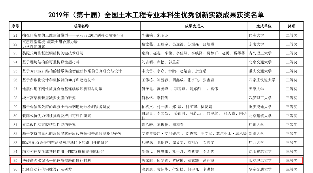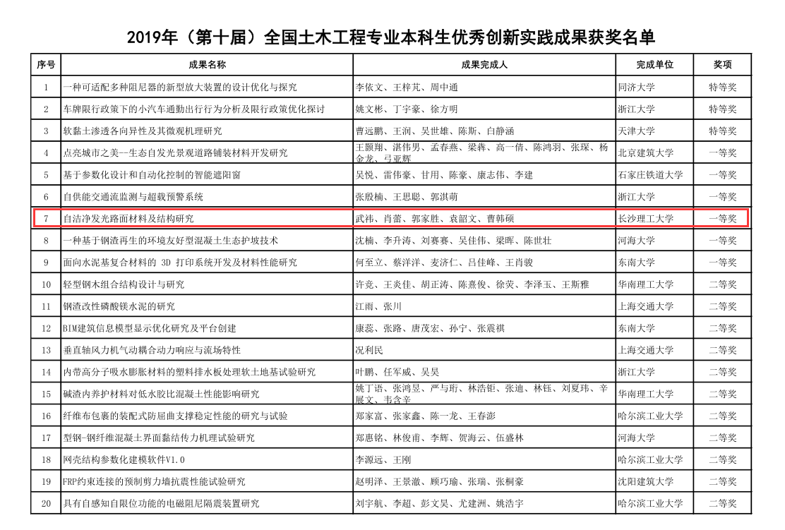 获奖项目为由交通学院土木工程(道路工程)专业武祎、肖蕾、郭家胜、袁韶文、曹韩硕同学完成的“自洁净发光路面材料及结构研究 ”项目(指导教师:交通学院高英力教授);交通学院土木工程(道路工程)专业郭家胜、邱梦萱、罗欣悦、章鑫辉、谭洲波同学完成的“快硬高强水泥毯——绿色高效路面修补材料”项目(指导教师:交通学院李九苏教授)。 2项成果依托“国家级大学生创新创业训练计划项目”,“校级大学生创新创业训练计划项目”,也是目前LETOU官网在此项国家级赛事中取得的最好成绩。