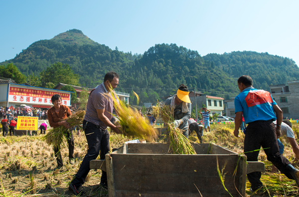之后,村民们开启了热火朝天的劳动比赛。在收割水稻比赛环节,随着裁判的一声哨响,各队村民迅速地挥舞着手中的镰刀,娴熟地收割着水稻,用最原始的方式打稻谷。在这个环节,各队需要在0.2亩稻田里完成收割、打稻谷、装袋等全部工作,以完成的时间长短计算成绩。最终,来自7、8、9组的3队以7分9秒的成绩获得了比赛第一。
