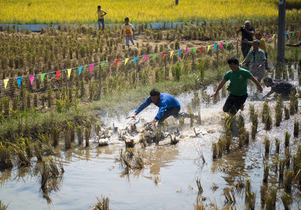 水稻收割以后,“鸭稻共生”水稻田的鸭子被赶到一块封闭的水稻田里,开始进行抓鸭子趣味比赛。在这个环节,村民下到稻田里抓鸭,在规定时间里抓到的鸭可以被视为奖品免费带走。比赛开始以后,在欢快的背景音乐下,各村民飞速跑向稻田,身手敏捷地向鸭子抓去。“今天晚上有鸭子吃啦,这鸭子没吃饲料长大的,好吃着呢!”村民杨家瑞抓到鸭子后高兴地说道。