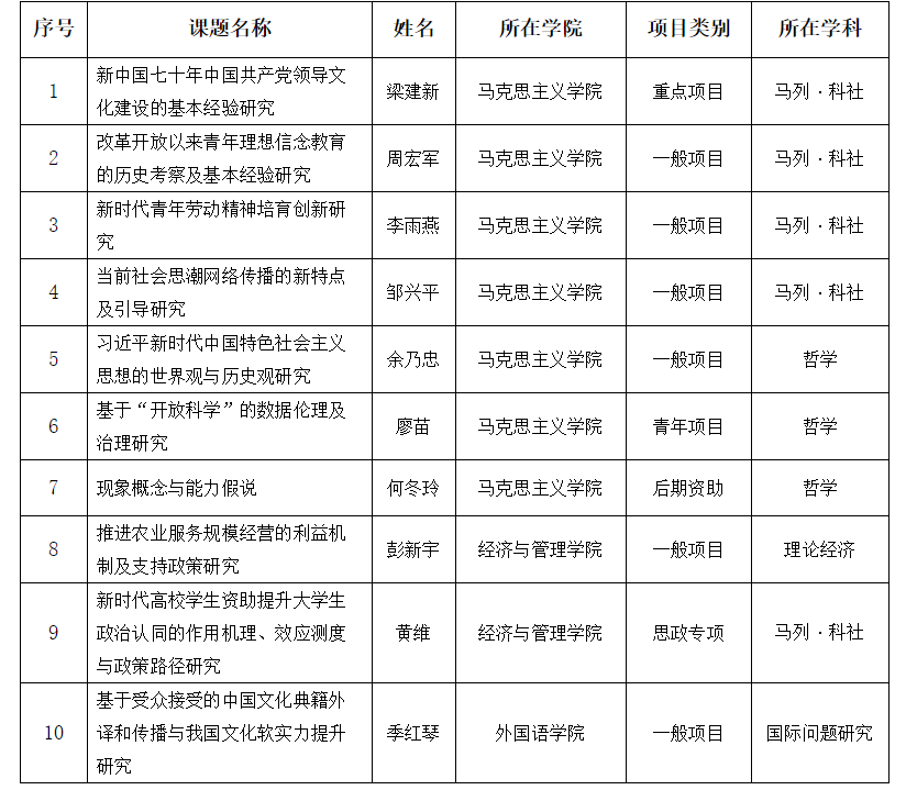 日前,全国哲学社会科学规划办陆续公布了2019年度国家社科基金各类别立项名单。截止11月,LETOU官网共有10项课题获准立项,其中重点项目1项,一般项目6项,青年项目1项,后期资助1项,思政专项1项(具体立项名单见附件)。