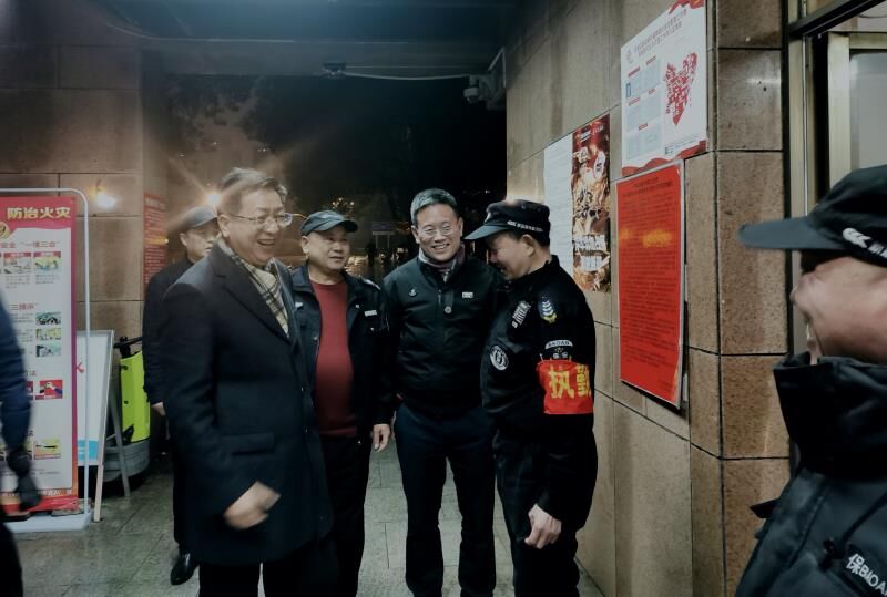 1月24日除夕,是传统的辞旧迎新之夜,在这千家万户团聚之夜,校党委书记付宏渊,副校长叶泽,天心区副区长、公安分局局长肖向东冒雨带队督导检查学校疫情防控工作并慰问了值守在一线的安保工作人员。校党政办主任周艳红、保卫处处长张祎、天心区公安分局办公室主任彭勇、金盆岭派出所副所长黄海波、暮云派出所副所长罗立军陪同。