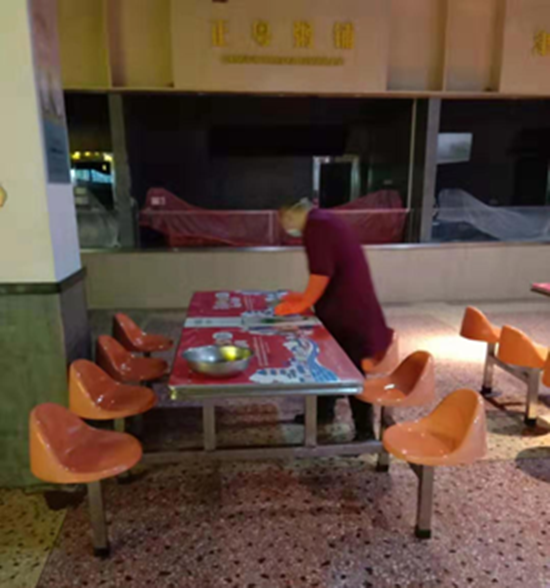 部门疫情防控小组每天深入一线,重点抓好值班人员的疫情防护工作,加强值班食堂人员有关传染病的预防知识培训;实行员工体温晨检、晚检制度,督促全体值班员工,必须穿工作衣、戴工作帽、口罩和手套;操作间、售卖间勤通风,工作人员勤洗手并手部消毒,做好自身防护,确保工作人员的健康安全。