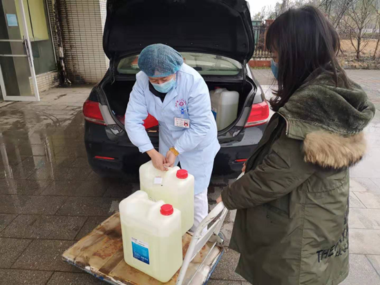 除了人员紧张,防疫物资紧缺也是摆在校医院面前的一道难题。大家动用一切资源,通过各种途径采购防疫物资,校医院书记、院长每天奔波于各大药店、药品供应商之间。长沙市青彩防艾志愿者服务中心捐助了800斤消毒液,没有搬运工,党员葛文新、梁秋平自告奋勇上前承担搬运任务。