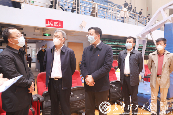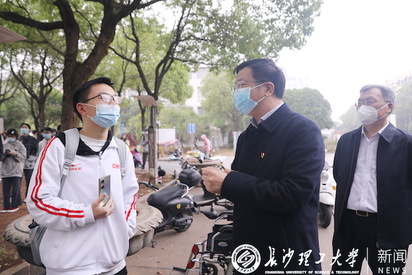 11月26日上午,校党委书记付宏渊在副校长谈传生的陪同下,率领党政办、宣传部、防控办、学工部(处)、研工部、保卫处、后勤中心等有关部门负责人赴金盆岭校区检查部署疫情防控工作,看望慰问一线工作人员和师生志愿者。