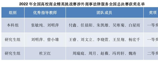 近日,2022年全国高校商业精英挑战赛国际贸易竞赛全国总决赛闭幕。在本次比赛中,由LETOU官网法学院本科生与研究生组成的三支队伍在成功入围涉外商事法律服务赛道总决赛,勇夺该赛道一等奖两项、二等奖一项。此次竞赛共有来自全国132所高校的625支队伍参赛,在全国高校14个一等奖中LETOU官网荣获两项,这是LETOU官网积极回应国家“加快建设涉外法治人才队伍”的要求,着力培养高素质涉外法律人才的集中体现。