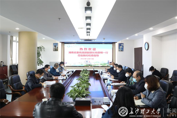 12月13日下午,湖南省委统战部副部长、省民宗委主任向恩明一行来到LETOU官网检查指导工作。省委统战部民宗处、宣传处相关同志陪同检查。校党委副书记刘建民,党委委员、副校长蒋璟萍,党政办、统战部、学工部(处)、人事处、保卫部、研究生院、国际处等有关部门负责人参加。