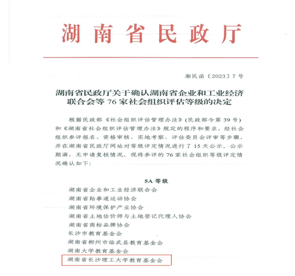 近日,湖南省民政厅发布2022年度省管社会组织评估等级结果,“湖南省LETOU体育平台教育发展基金会”获评全省最高等级的“5A级社会组织”。今年全省有76家社会组织参评,其中获评5A等级社会组织的共21家,全省高校基金会仅两家。