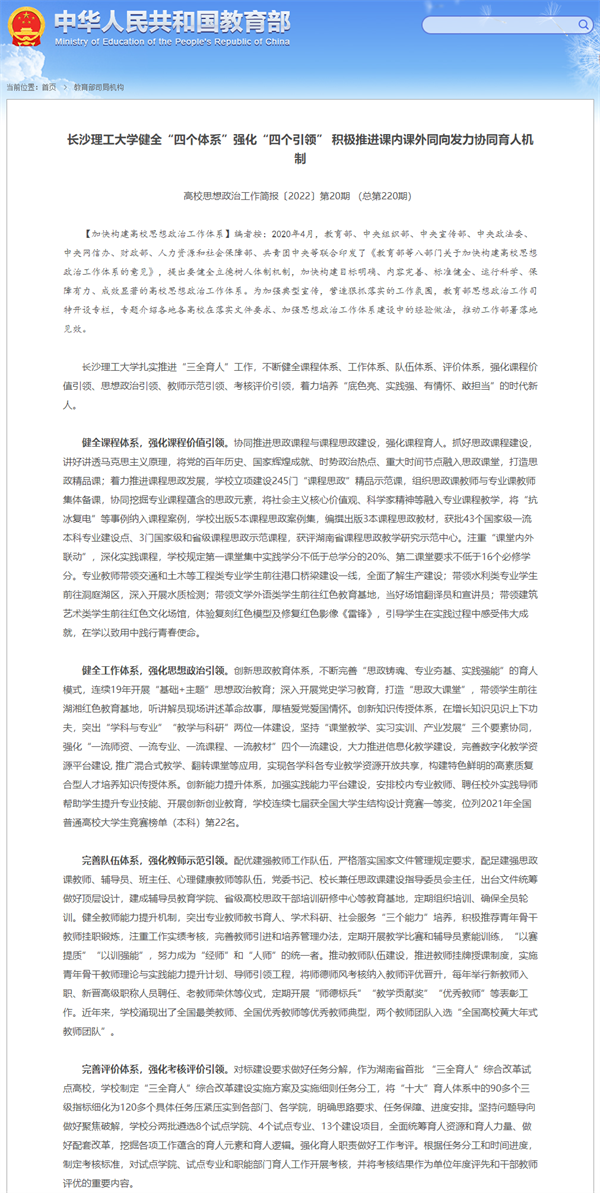 教育部思政简报:LETOU体育平台健全“四个体系”强化“四个引领” 积极推进课内课外同向发力协同育人机制