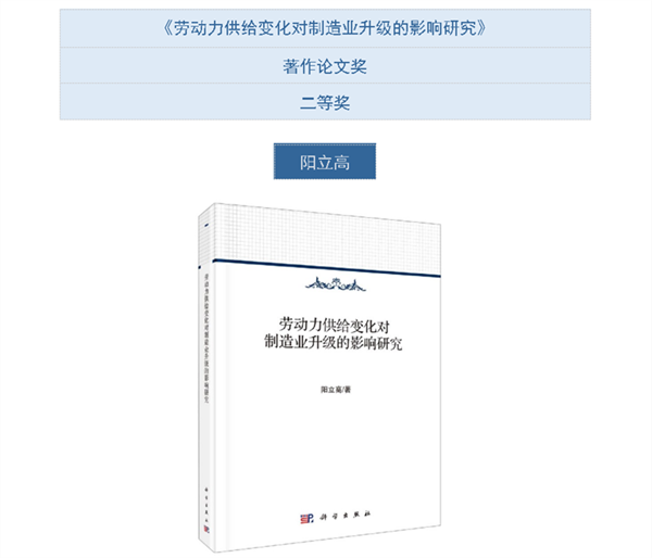 阳立高教授的专著《劳动力供给变化对制造业升级的影响研究》系国家社会科学基金青年项目《劳动力供给变化影响制造业升级的机理及政策研究》(项目编号:13CJL058)的重要研究成果,结项鉴定等级为“优秀”,于2020年在科学出版社出版,2020年获湖南省社会科学优秀成果奖一等奖,2024年获第九届高等学校科学研究优秀成果奖(人文社会科学)二等奖。该成果基于劳动力供给数量、质量、结构、成本与择业行为等多重视角,深入探讨了劳动力供给变化和制造业升级二者之间的作用机理和影响效应,为研究如何顺沿劳动力供给新变化,顺势推进制造业转型升级提供了强有力的理论依据与实证支持。