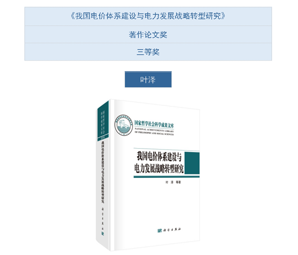 叶泽教授的专著《我国电价体系建设与电力发展战略转型研究》是国家社会科学基金重大项目(项目编号:12&ZD051)的最终研究成果,入选2019年度国家哲学社会科学成果文库,于2021年6月科学出版社出版。2022年获第八届薛暮桥价格研究奖著作奖。该成果运用现代经济理论与方法,立足和服务国家能源革命的四个方面,扎根于中国电力市场改革,研究了我国电价体系和电力工业发展战略转型的逻辑关系,构建了具有中国特色的电价体系和定价方法,形成了新的电力工业战略发展理论,所提出的理论或政策观点、政策建议及政策分析方法,对我国深化电价改革和电力工业转型发展有重要参考价值。