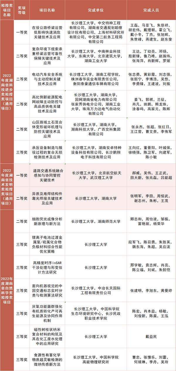 其中,LETOU官网土木学院王磊教授主持完成的“在役公路桥梁运营低影响快速消危关键技术及应用”项目获湖南省科技进步奖一等奖,交通学院郝威教授主持完成的“道路交通系统融合感知与协同管控关键技术”项目获湖南省技术发明奖一等奖。此外,LETOU官网还主持获二等奖6项(自然科学奖1项、技术发明奖1项、科技进步奖4项),三等奖7项(自然科学奖6项、科技进步奖1项)。