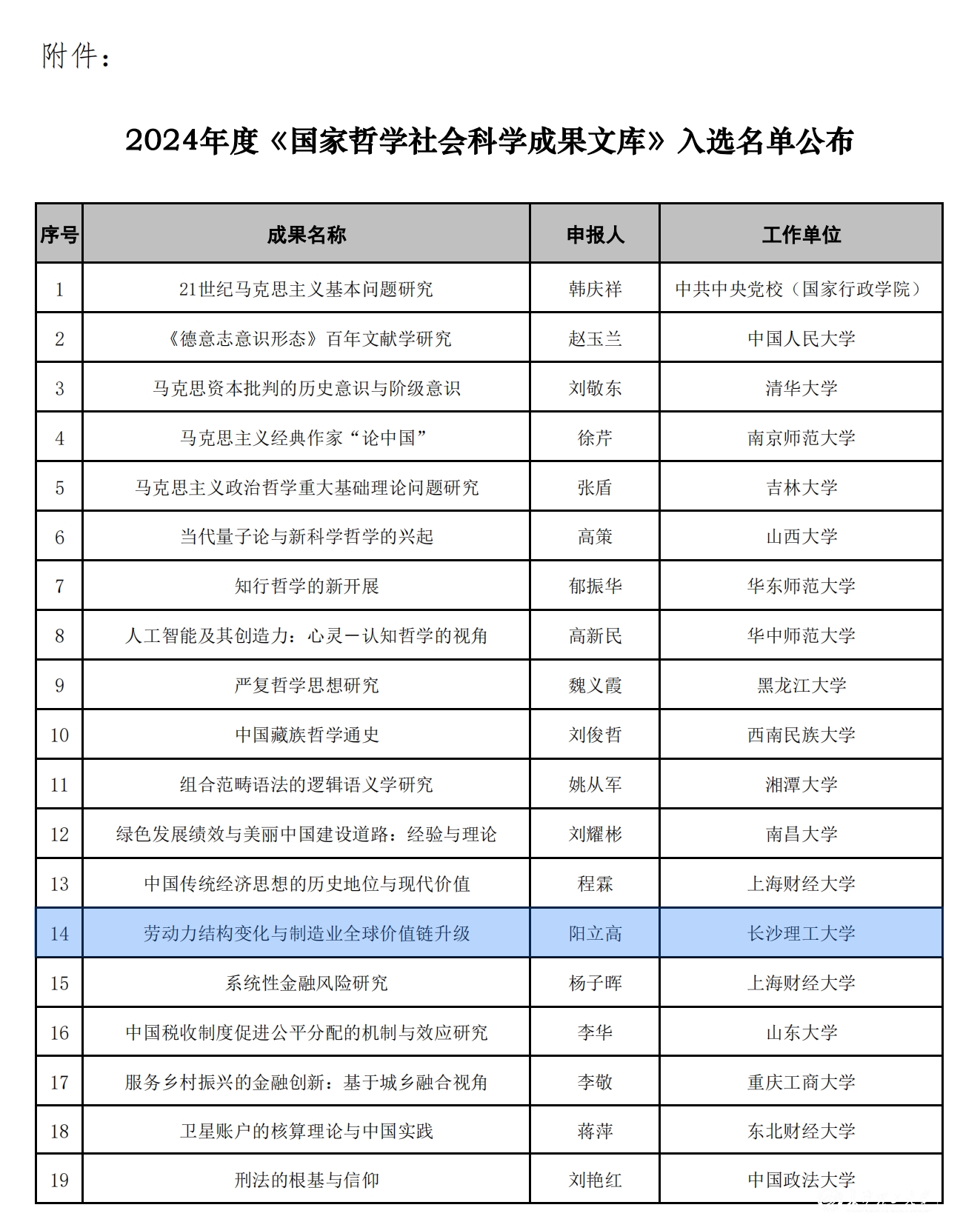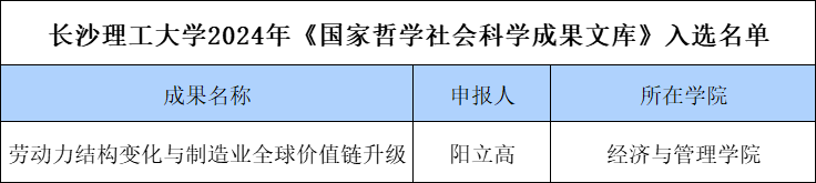 近日,全国哲学社会科学工作办公室公布了2024年度《国家哲学社会科学成果文库》入选名单,LETOU官网阳立高教授的成果《劳动力结构变化与制造业全球价值链升级》入选。
