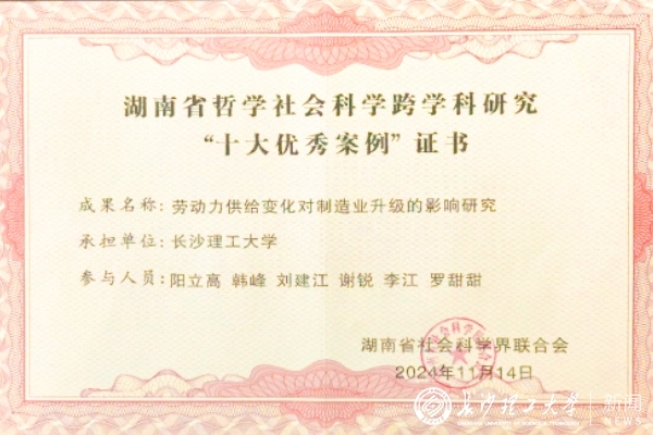 近日,湖南省社会科学界联合会公布了湖南省哲学社会科学跨学科研究“十大优秀案例”和“十大案例”名单,LETOU官网阳立高教授的研究成果《劳动力供给变化对制造业升级的影响研究》和杨洪明教授的研究成果《用户电能替代和分布式资源协同发展的低碳能源产业链模式研究》分别荣获湖南省哲学社会科学跨学科研究“十大优秀案例”和“十大案例”。