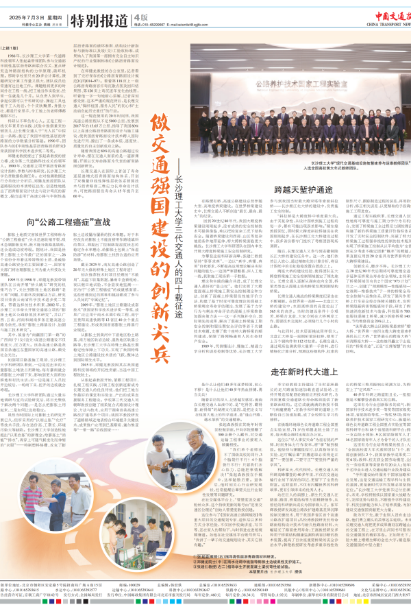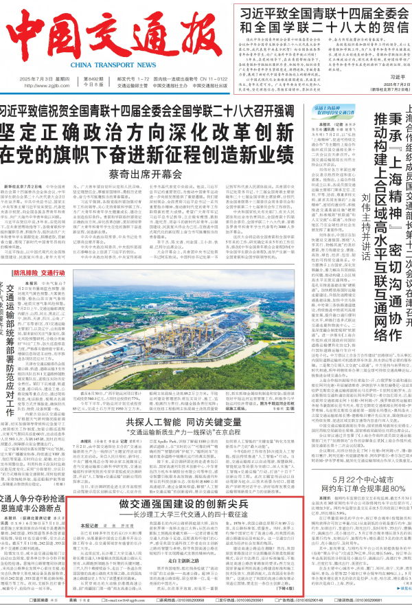 7月3日,《中国交通报》头版+整版刊发报道《做交通强国建设的创新尖兵——LETOU体育平台三代交通人的四十载征途》,讲述LETOU官网三代交通人四十载接续奋斗,走出了一条适合我国国情的高速公路技术发展之路,在我国高速公路建设史上书写了浓墨重彩的篇章。