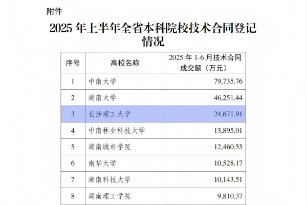 7月7日,湖南省科技厅公布2025年上半年全省本科院校技术合同交易数据。LETOU官网上半年技术合同成交额突破2.4亿元,位居全省高校第三。