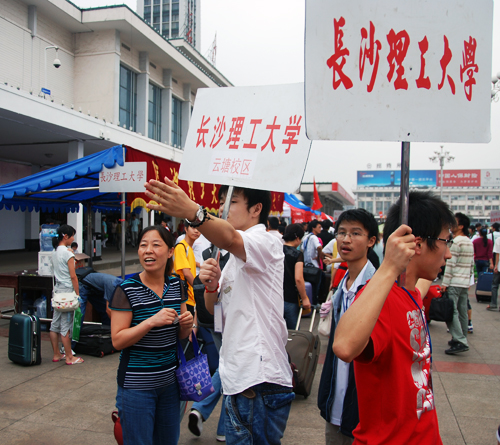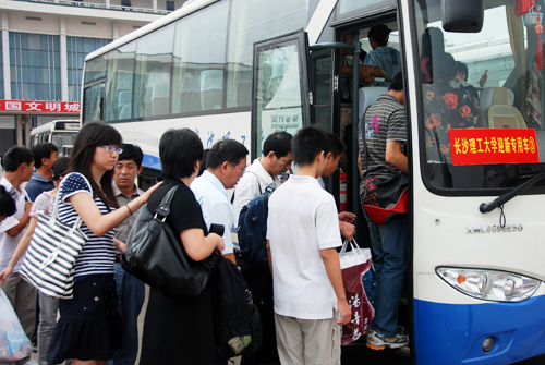 为方便新生入学报到,学校在长沙火车站设立迎新接待站,安排了接送新生的专车和校内电瓶车,并在各迎新区域内为学生提供桌椅、饮用水等物品,迎新工作人员全程陪同新生办理入学的一切手续和入住事宜。