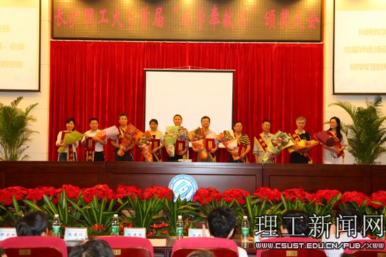 与会校领导上台为获奖老师颁奖、授绶带,校百优(十佳)大学生代表为获奖老师献花。会场上欢快的背景音乐伴随观众们此起彼伏的掌声,让每一位获奖教师充分的感受到学校对他们辛勤工作的充分肯定。