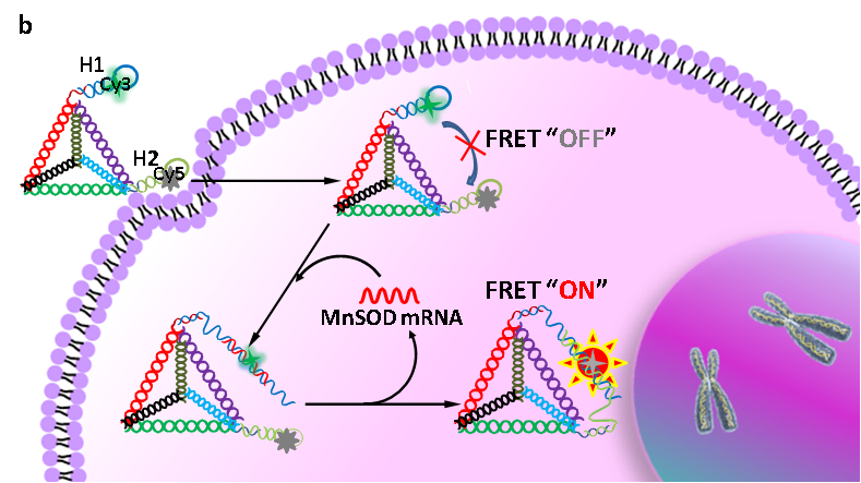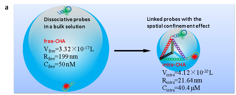 图1:(b) 根据碰撞效率理论,intra-CHA和free-CHA探针理化参数的推算;(b) intra-CHA探针对细胞内mRNA的原位信号放大成像过程示意图.