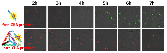 图3:不同CHA产物在活细胞内的信号变化,intra-CHA具有更好的信号稳定性。