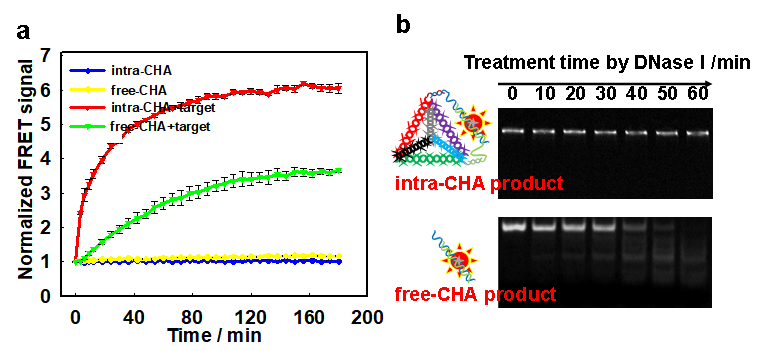图2:(a) 不同CHA体系下的实时荧光监测;(b)不同CHA产物抗酶切过程的电泳标准。