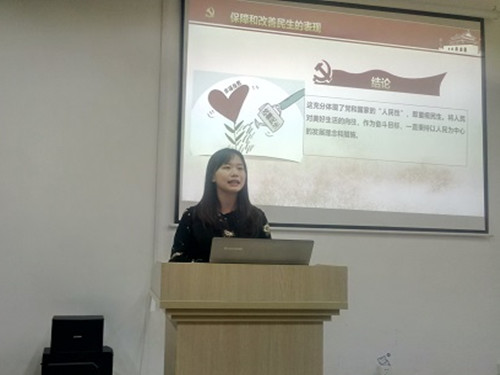 最后银波指出从十九大报告可以感受到国家、党对于青年的关心与期望,实现“两个一百年”奋斗目标,千千万万的青年将全过程参与,作为国家发展的主体,大学生党员更要深刻领悟习近平新时代中国特色社会主义思想的精髓,奋勇拼搏,不断提升创新精神和实践能力,为实现中国梦添砖加瓦。