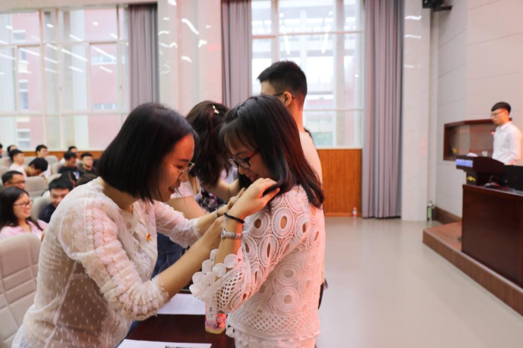 在党员同志的共同见证下,到场老师分别为新发展的52名党员依次授徽并给与嘱咐与祝福。其后,本科生第二党支部同志刘轩宁领誓,全体党员面向党旗庄严宣誓。学院为本学年度优秀党务工作者颁发受聘证书,肯定他们在学生党建工作中的出色表现。