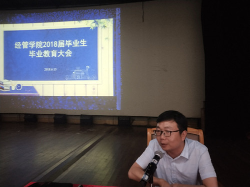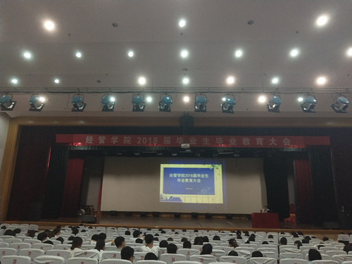 为进一步做好2018届毕业生毕业教育和文明离校工作,6月13日晚,经管学院2018届毕业生毕业教育大会于金盆岭校区五教大礼堂举行,学院党委副书记涂道勇、毕业生辅导员庄奕、计潇出席,2018届全体毕业生参加。