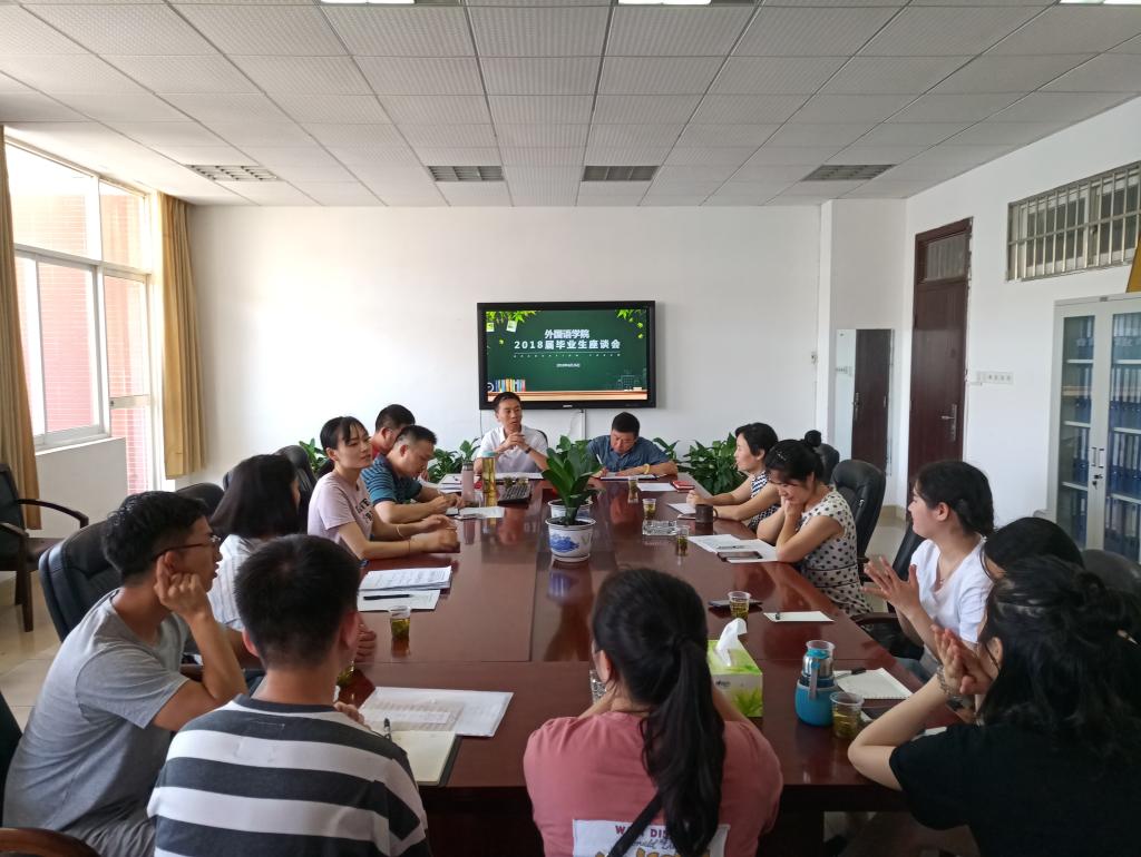 6月26日上午,外国语学院在云塘校区文科楼A603召开2018届毕业生代表座谈会。副院长黄坚、武俊辉,外国语言文学系党支部书记段静、副主任胡伟、教务办主任王爱华、科研办主任马丁和毕业生辅导员刘莎参加,会议由党委副书记陈仁凯主持,8名本科和硕士毕业生代表参加了此次座谈会。