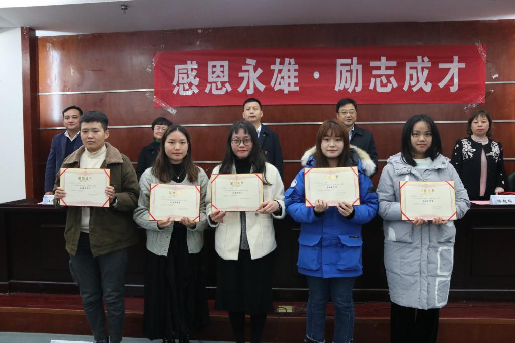 郑延恒宣读获奖表彰文件。与会领导、嘉宾共同为获奖学子颁发获奖证书。雷蕾同学、熊燕同学分别代表奖学金获得者和助学金获得者发言。在发言中,她们表示将会以获奖受助为一个新的起点,继续努力学习,创造优异成绩,不负永雄集团和学校的殷切期望。