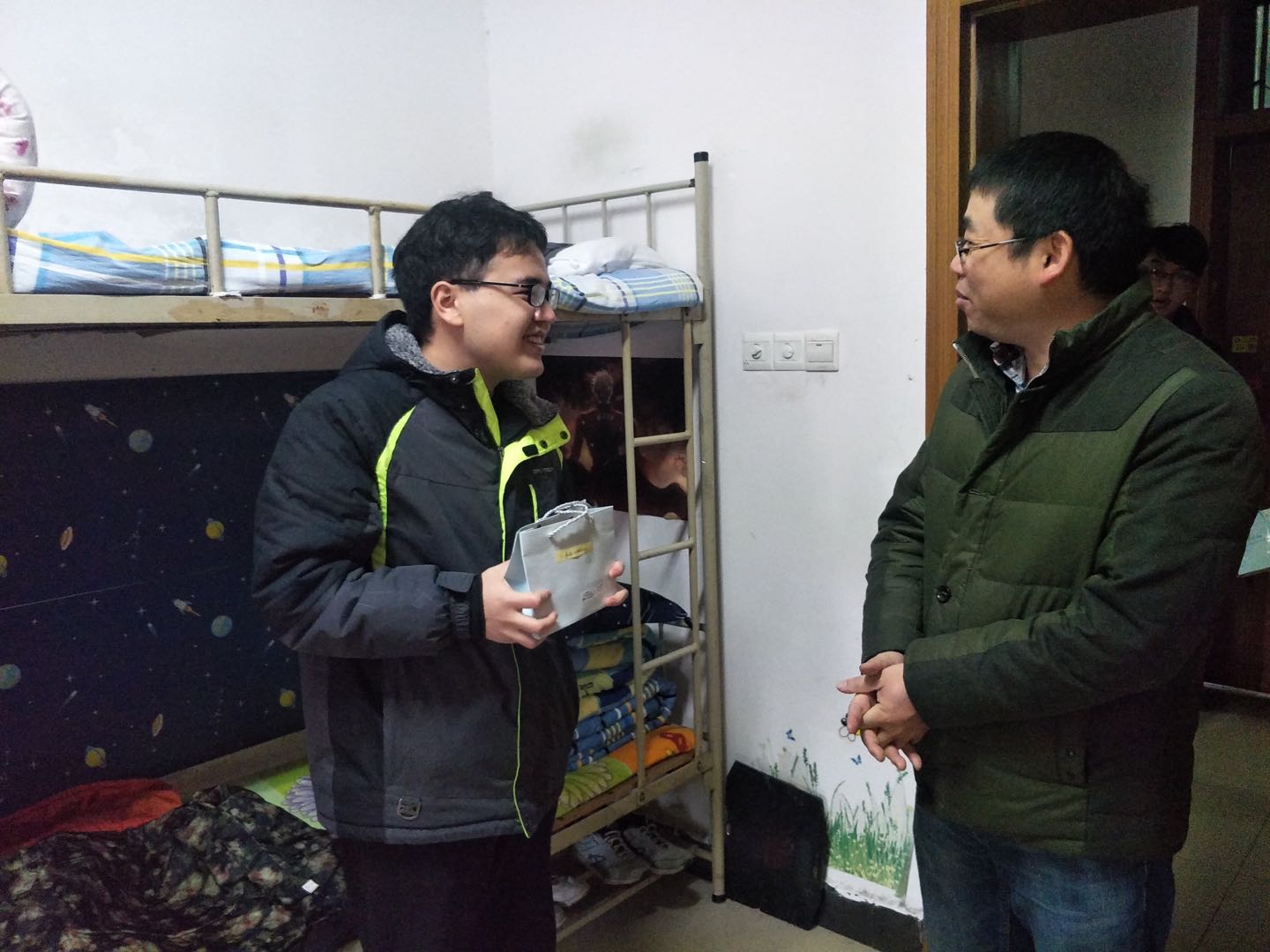 老师们兵分四路,为考研的同学们送上惊喜,大家看到老师的到来,又温暖又感动。陈冬林温暖地对同学说道:“养兵千日用在一时,大家要调整好状态,发挥正常水平。”他还叮嘱大家这几天尤其要吃好休息好,保持平常心。副院长何建军和党委专职组织员来到行4的六楼,为来自新疆地区的法力克和凯赛尔两位同学送上祝福,并仔细询问报考院校和复习情况,两位同学纷纷表示立志考上母校,已经做好了准备!