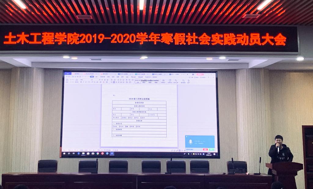 实践部李自成宣读了《土木工程学院关于开展2019-2020年寒假社会实践活动的通知》,向同学们介绍了挑战杯竞赛、互联网+竞赛等创新创业比赛情况。希望大家能把竞赛项目和社会调查、创新创业实践、志愿公益服务、专业实践等实践活动紧密结合起来。他重点介绍了本次寒假社会实践的新变化,开展以年级为单位的分层次社会实践。大一学生主要开展工程师访谈,做好个人成长方案;大二学生结合实践情况,开展大学生生活总结。大三学生根据考研或就业规划,做好报考学校见闻报告和个人简历;大四学生做好工作单位和实习单位了解,为入职做好准备。