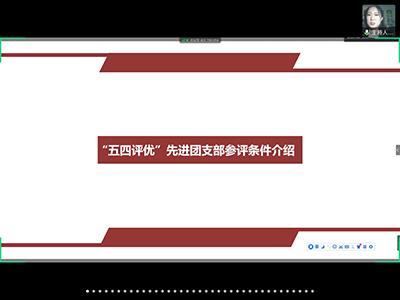 会议伊始,主持人宣读了参评条件与答辩顺序。随后,各答辩人员以PPT、视频等方式为媒介进行答辩展示,先进个人的候选人分别从专业学习、个人事迹总结、学生干部经历三方面入手,向大家全方位的展示自我。紧接着,8个团支部负责人分别从支部特色、支部荣誉、未来计划与展望等方面进行汇报。会议最后,秦子玲、文丽丽对会议进行总结发言,其中秦子玲引用习主席所提出的“六要”呼吁青年学子要不断奋斗砥砺前行、不负韶华,而文丽丽则重点强调要明确支部未来的发展方向,并要求学生干部带领各支部成员向优秀看齐向先进学习。