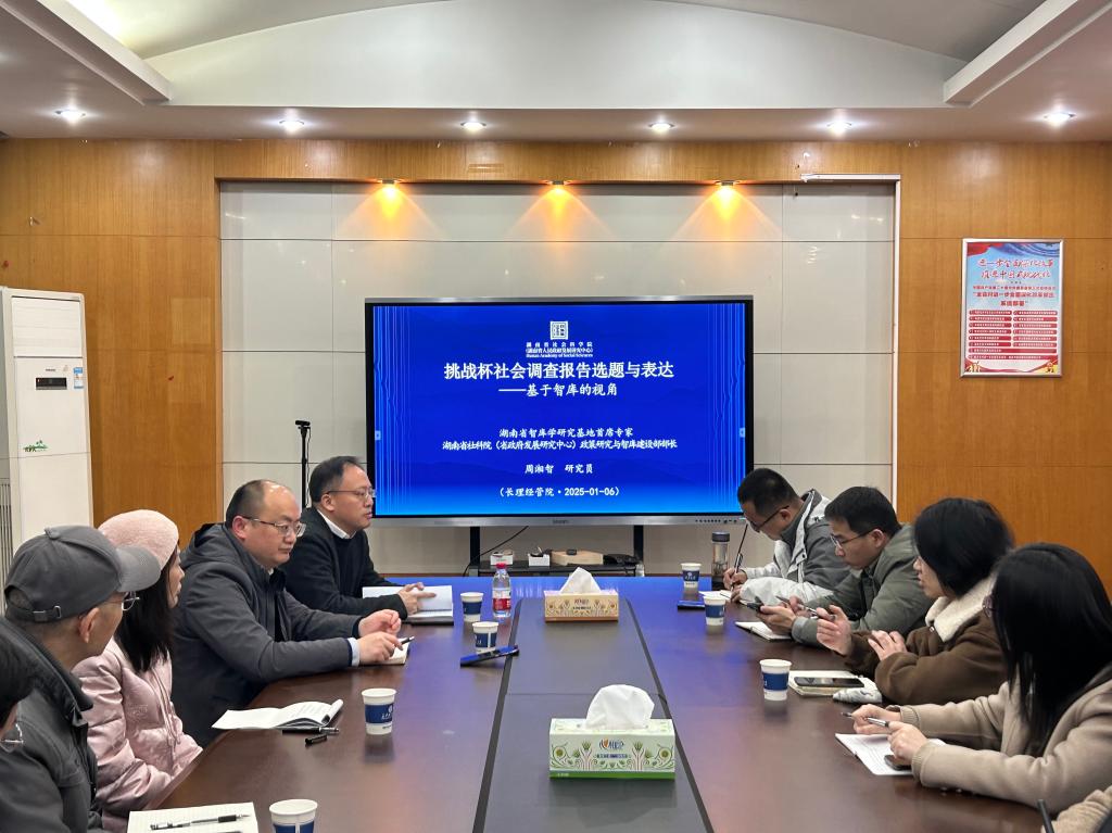 1月6日晚,经管学院于经管大楼307举行2025年“挑战杯”备赛培训会。会议邀请了湖南省智库学研究基地首席专家、湖南省社科院政策研究与智库建设部部长周湘智受邀作题为《挑战杯社会调查报告选题与表达——基于智库的视角》的报告。院长彭新宇、院党委副书记汪功伟以及三十余位师生代表参加。