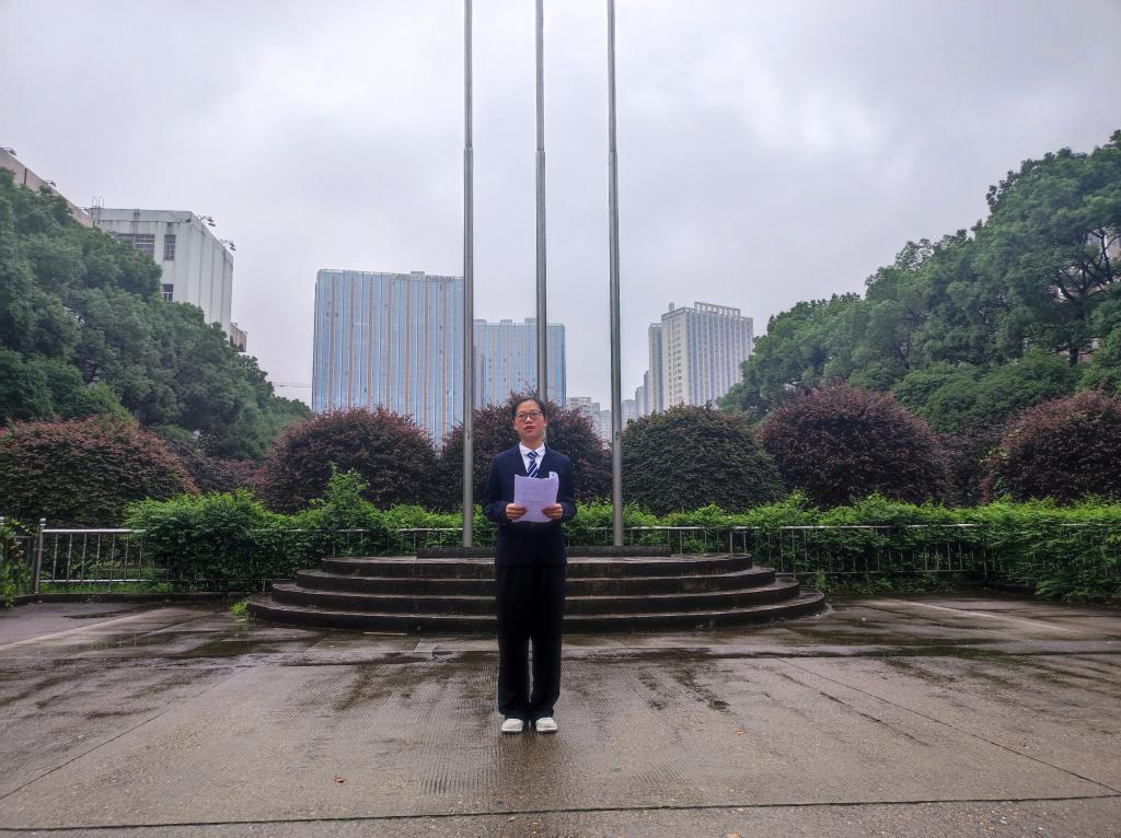 随着国歌奏响,同学们昂首挺胸行注目礼,目光随着国旗缓缓上升,迎着飘落的雨滴,心中燃起昂扬的青春之火。随后民兵连同志带领全体成员进行宣誓,誓做有担当、敢做为的新时代青年。升旗仪式结束后,土木2106班姚燕英在国旗下以“青春心向党,喜迎二十大”为题进行演讲。她说“生逢盛世,当不负盛世,生逢其时,当奋斗其时。”对于已经到来的期末考试月,她呼吁大家“人无信而不立,希望同学们以诚信考试为荣,以违纪作弊为耻,弘扬求实学风,维护知识尊严!”最后,邓文杰就近期同学们比较关心的期末备考、学科竞赛、宿舍搬迁、安全教育等问题逐一说明并预祝大家考试顺利。