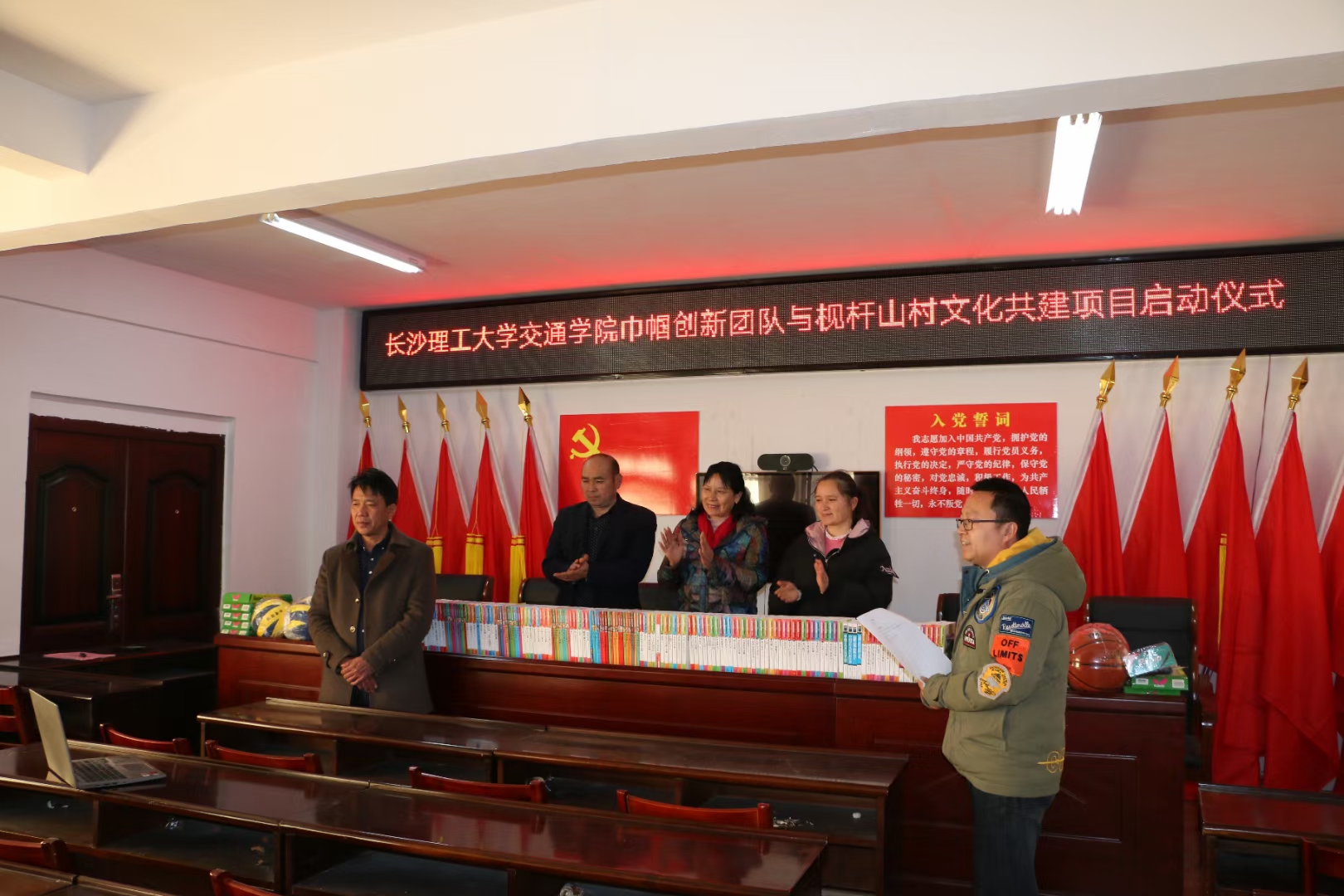 下午3点,交通学院巾帼创新团队与枧杆山村文化共建项目启动仪式在枧杆山村村部一楼会议室举行,孔伟红代表交通学院向枧杆山村捐赠了图书、体育器材等物资,枧杆山村新一届村支书兼村主任杨忠祥对交通学院的捐赠表示感谢,宋刘斌对枧杆山村的文化建设进行了全面介绍,巾帼创新团队负责人金娇博士对开展文化共建活动的初衷以及以后活动开展的一些思路进行了说明。