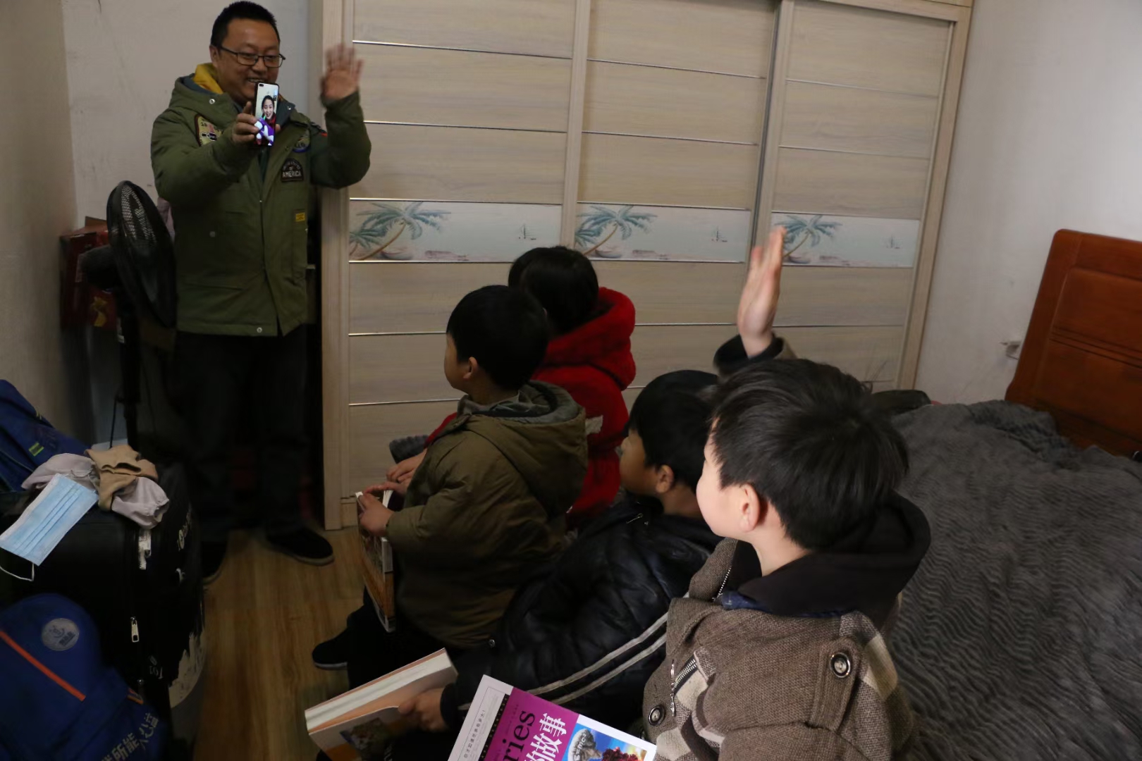 上午9点,扶贫队来到贫困户唐顺莲家中,接通了侯云飞老师的视频电话。在视频电话中,侯云飞为唐顺莲的孙子、孙女送去了精美的图书,并提前祝他们新年快乐,鼓励他们假期好好学习,将来成为一个对祖国有用的人。之后,金娇、韦慧两位老师也通过视频电话分别为扶贫点的其他小朋友送上了图书和新年祝福。