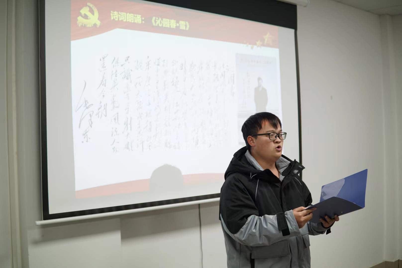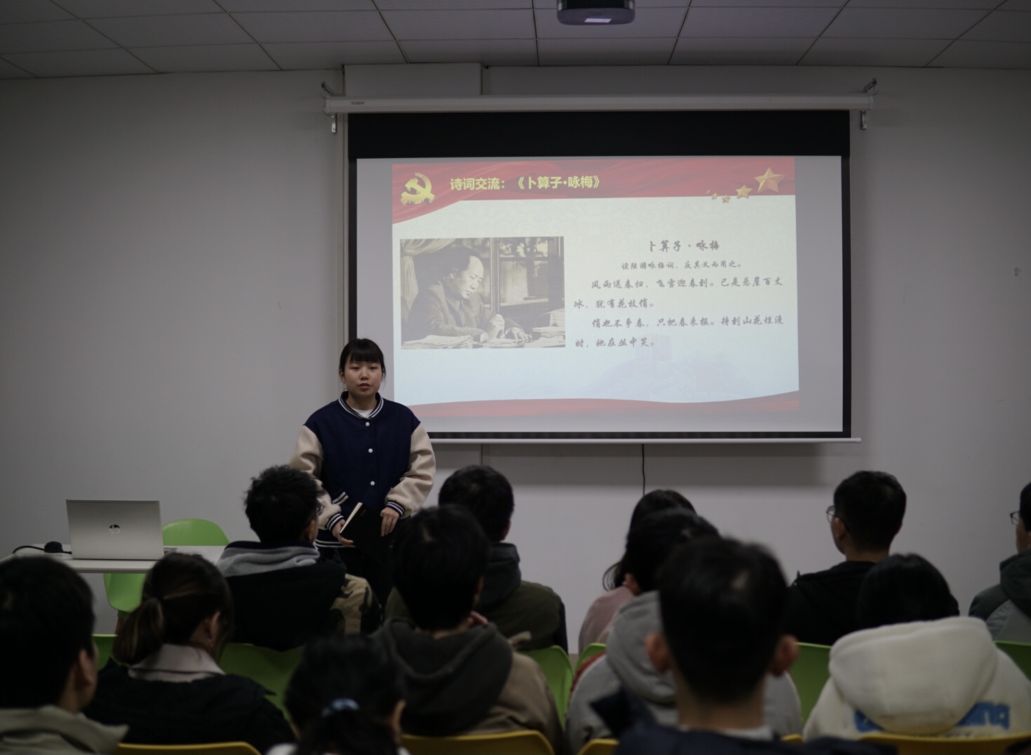 诵读活动在诗歌朗诵《沁园春·雪》中拉开序幕,学生党员周颖韬用铿锵有力的声音、饱含深情的朗诵,重温了毛主席的诗词佳作,感受一代伟人远大的志向、宽广的胸襟、非凡的魄力和崇高的精神境界以及诗词中蕴含的风采。交流会还选取了《卜算子·咏梅》、《忆秦娥·娄山关》等脍炙人口、耳熟能详的经典诗词,通过师生党员对其创作背景、意象境界、艺术风格等进行了细致形象地描述,将同学们带回到往昔那个家国相忧、血火相淬的峥嵘岁月。