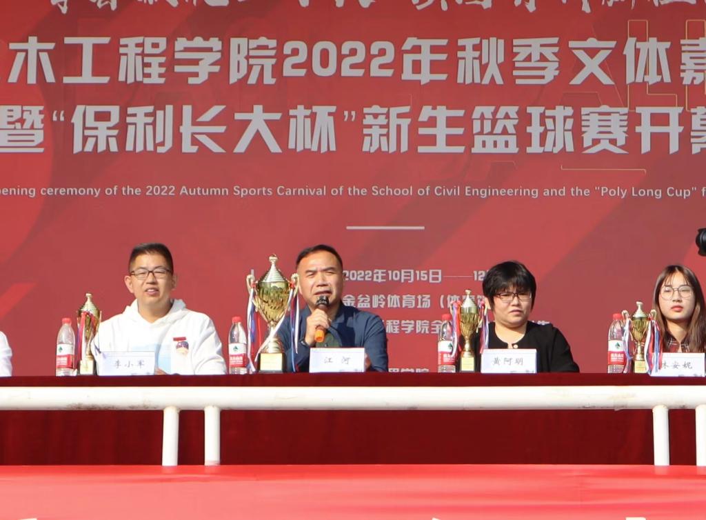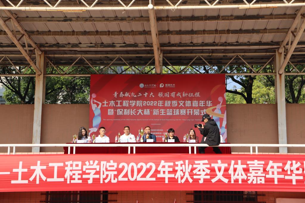 为喜迎党的二十大胜利召开,深入贯彻落实习近平总书记关于文艺、体育工作的重要论述,丰富新生校园文化生活,增强集体凝聚力,10月15日,土木工程学院2022年秋季文体嘉年华暨“保利长大杯”新生篮球赛在金盆岭校区田径场隆重开幕。学院党委书记江河,学院党委副书记兼副院长黄阿明,学工办李小军、林安妮及2022级全体学生参加开幕式。2022级年级组副主席赵奕博主持大会。