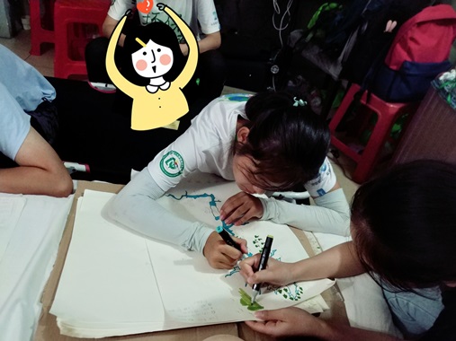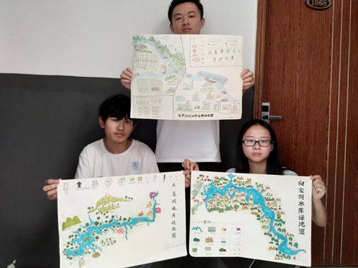 首先,绘图组负责人汤安妮简述了绿地图绘制的要点,要求根据前期生态调研记录的数据,实事求是反映调研区段内的生态状况,其中包括水环境状况、动植物分布、文化景观及防环境污染的设施等。经过近7个小时的相互配合和分工合作,队员们成功将调研资料与地图相结合,完成了绿地图绘制,为“净源之夜”晚会调研成果展示及引导居民保护饮用水水源地提供有力资料。
