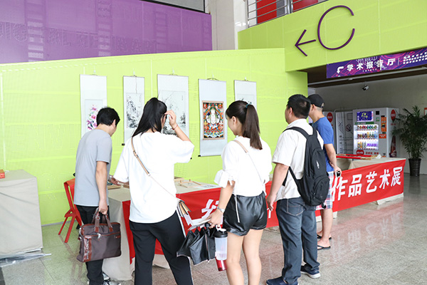 迈进艺术楼,首先映入眼帘的便是小红绣作品的宣传片。此次小红绣刺绣艺术展出包括台灯、屏风、钱包、手帕、扇子、特色刺绣本、布面枕头和挂画在内的20件手工刺绣品。扇子上的牡丹花,花色鲜艳,绿叶以衬,蝴蝶于其上翩翩起舞、惟妙惟肖;灯罩上含苞待放的荷花,针针精准,线线交错,叠加出花瓣的柔美;挂画的山水以线的韵美展现山势壮阔;布面枕头的孩童趴着浅眠,展现出孩童的天真烂漫。同时还新设了体验区,让艺术学子亲身体会刺绣的乐趣,感受刺绣的美。精美的刺绣吸引了许多艺术学子驻足观赏,建筑艺术楼大厅内一时热闹非凡。
