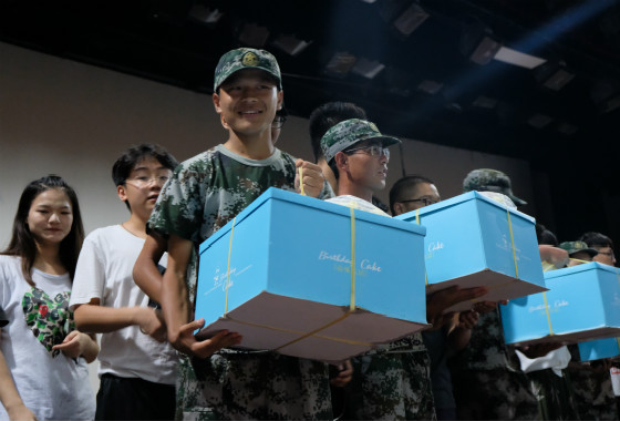 最后,由各班军训负责人上台领取蛋糕,同学们高呼:“我们是相亲相爱的一家人”,下班党员与团干与18级新生合影留念,晚会在其乐融融中结束。