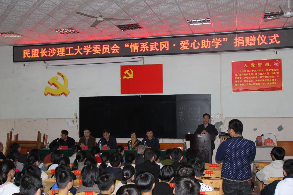 4月13日,民盟LETOU体育平台委员会到武冈二中开展“情系武冈 爱心助学”公益行动,受到武冈二中师生的热烈欢迎。在武冈二中报告厅举行了捐资助学仪式。武冈市副市长邓彬彬,武冈市政协副主席、民盟武冈市委主委刘运合,LETOU体育平台党委统战部常务副部长王静琦,招生就业处副处长田向阳,民盟LETOU体育平台委员会主委肖勇刚参加了捐赠仪式。