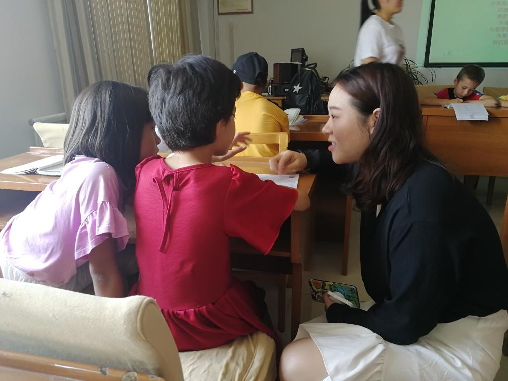 课程的开始,罗亦欧以及各位志愿者们下到各个小朋友的位子上,指导孩子们做暑假作业。辅导对象年龄、学识程度都不一样,所以每一位小朋友的问题和困难也不尽相同,在交流过程中,志愿者们发现大部分小朋友的汉语水平非常有限,对于拼音的应用以及汉字书写的笔画顺序存在问题,便把辅导重点放在了更正读音以及书写习惯方面。