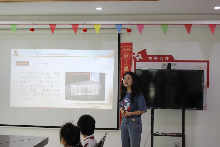“山高路远坑深,大军纵横驰奔。谁敢横刀立马?唯我彭大将军。”在孩子们抑扬顿挫的齐声朗读中,张苏湘讲师开始了她的宣讲。张苏湘讲师结合彭德怀元帅的生平事迹首先讲述了彭德怀元帅是从湘潭县走出的“一个勇敢的农民的儿子”。其次,以彭德怀元帅改名为“德怀”的故事为孩子们介绍了忠党爱国,亲民爱民的彭德怀元帅。