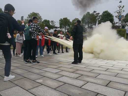 讲座结束,开展了逃生和灭火演练,在场新生用手或毛巾捂住口鼻,按照火场逃生要领,撤离到安全区域;在灭火演练中,教官指导新生现场灭火,现场操作灭火器扑灭火盆。
