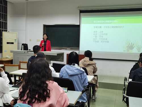 李丽兰带领全体学生体验了“心理健康知多少”现场测试,激起了大家对于学习心理健康知识的好奇心与探索欲。她从心理健康的含义与标准、朋辈心理互助员工作概述、心理危机的识别与处理三大方面,结合大学本科生与研究生当下关注的热点问题,深入浅出地进行知识讲解,风趣幽默的讲课方式让同学们学习到不少心理健康知识与助人技能。
