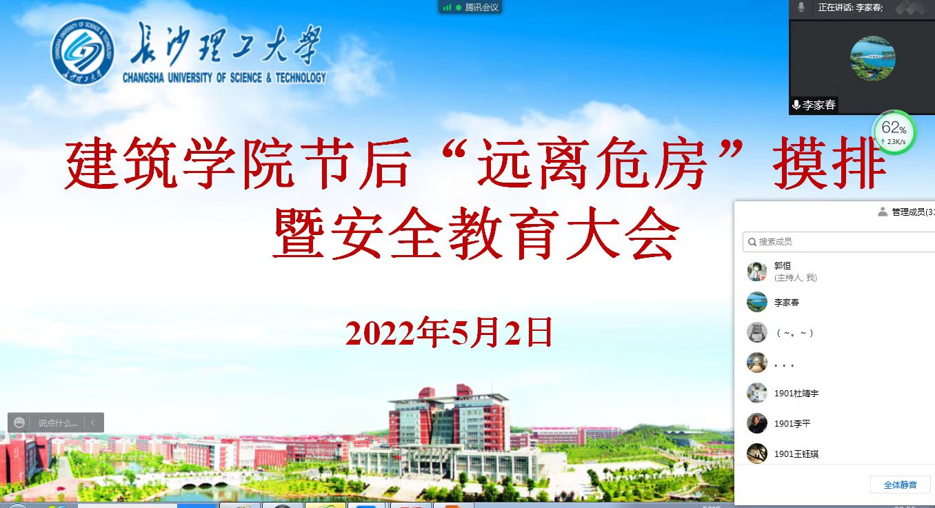 为深刻汲取近期国内外重大安全事件教训,补齐漏洞短板,坚决维护广大师生生命安全,5月2日,建筑学院组织开展了“远离危房”专项排查活动,全面掌握学生走读和外宿情况,消除安全隐患,通过召开年级大会和主题班会等形式,采取线上与线下相结合的方式,进一步加强学生安全教育和管理,全院学工老师和学生共同参与。