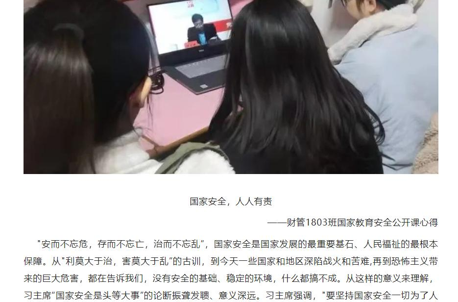 家是最小国,国是千万家。国家安全与每位公民息息相关。今年4月15日是第7个全民国家安全教育日,此次全民国家安全教育日主题为“树牢总体国家安全观,感悟新时代国家安全成就,为迎接党的二十大胜利召开营造良好氛围”。经管学院组织本科生和研究生观看学习了国家安全的相关视频。在观看视频期间,同学们全神贯注,认真学习专家的讲解,并记录下自己的心得与体会。