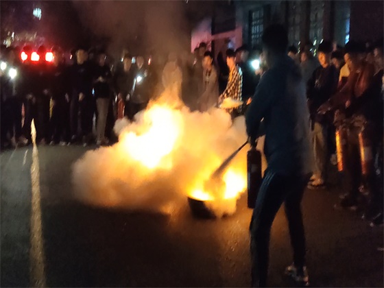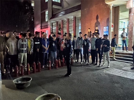 在工作人员的引导和同学们的积极配合下,消防演习活动于行健轩三号楼顺利有序开展。18点40分警报声响起,同学们迅速进入紧急疏散状态,全体学生用湿毛巾、衣服等捂住口鼻按照预先的消防演习方案有序撤出宿舍,快速到达安全区域。随后,保卫处易老师给全体学生详细讲解了灭火器的使用方法,并现场进行演示,并邀请部分学生体验使用灭火器的过程。