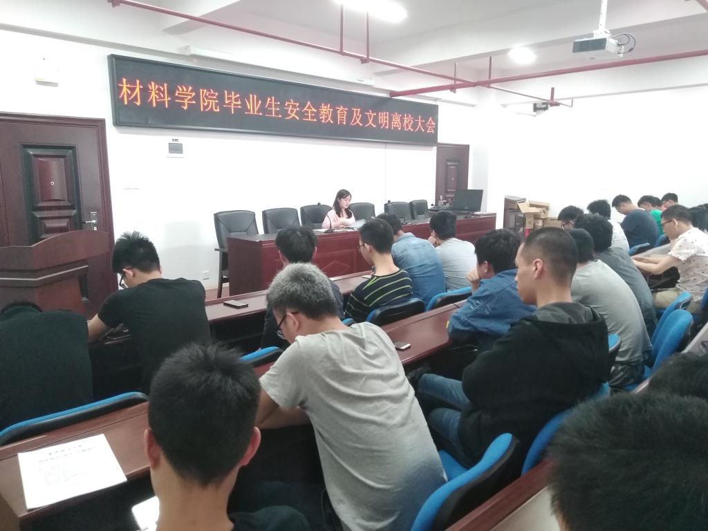 4月20日,材料学院在新能源大楼302召开了毕业生安全教育及文明离校年级大会。年级辅导员谢易真出席并主持本次大会,14级全体学生参加。